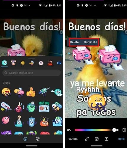 添加贴纸:贴纸图标可添加贴纸,能从 Telegram 建议贴纸中选,也可用搜索选项找特定贴纸。若贴纸周围无虚线,点击两次可看到 “删除和复制” 选项。点击贴纸周围蓝点拖动可放大贴纸。