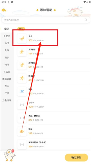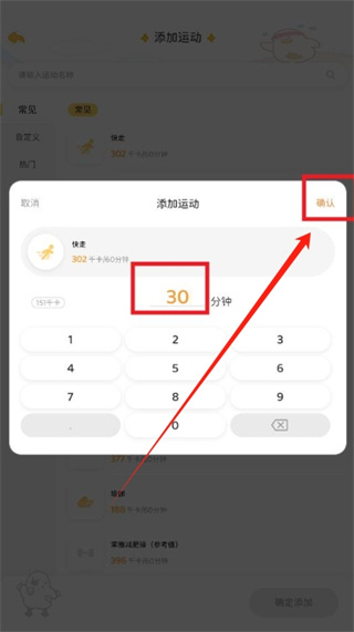 4、在详细的记录中输入今日的记录时间,软件会自动根据时间计算出消耗的热量信息,点击右上角的确认进行记录。