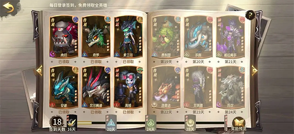 全英雄签到活动:每天登录领取一只,累计天数那个抽卡获得的英雄会比较好。这个活动是全部英雄送一遍,可以尝鲜。