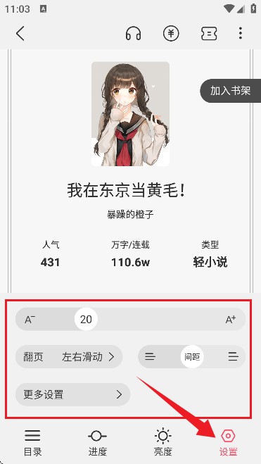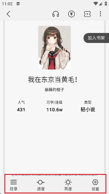 6、这里可以查看小说目录,进度,可以设置界面亮度,以及设置阅读效果;