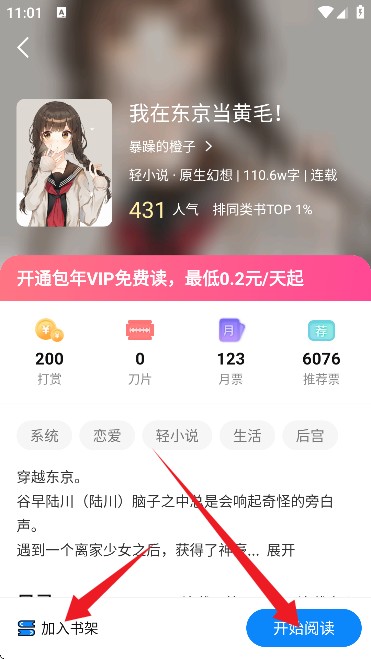 5、选择一本小说点击进入到详情页,这里可以查看到小说介绍,可以加入书架,然后点击【开始阅读】进入到正文阅读界面。