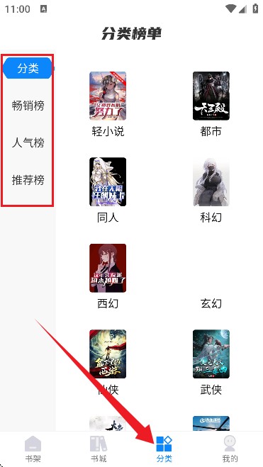 4、分类中可以看到各种类型的小说板块。如畅销榜、人气榜、推荐榜等。