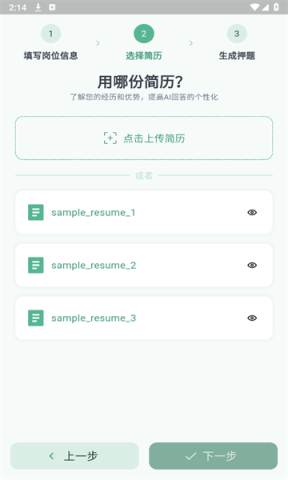 软件会根据你所选岗位自动生成信息,接着上传简历,点击下一步。