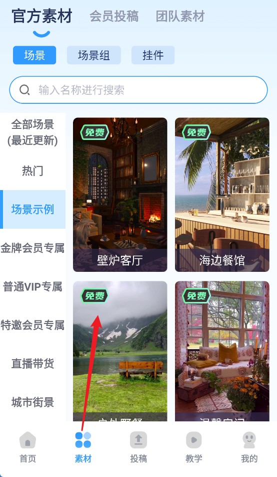 2、点击素材页,选择各种免费或付费丰富创作资源。