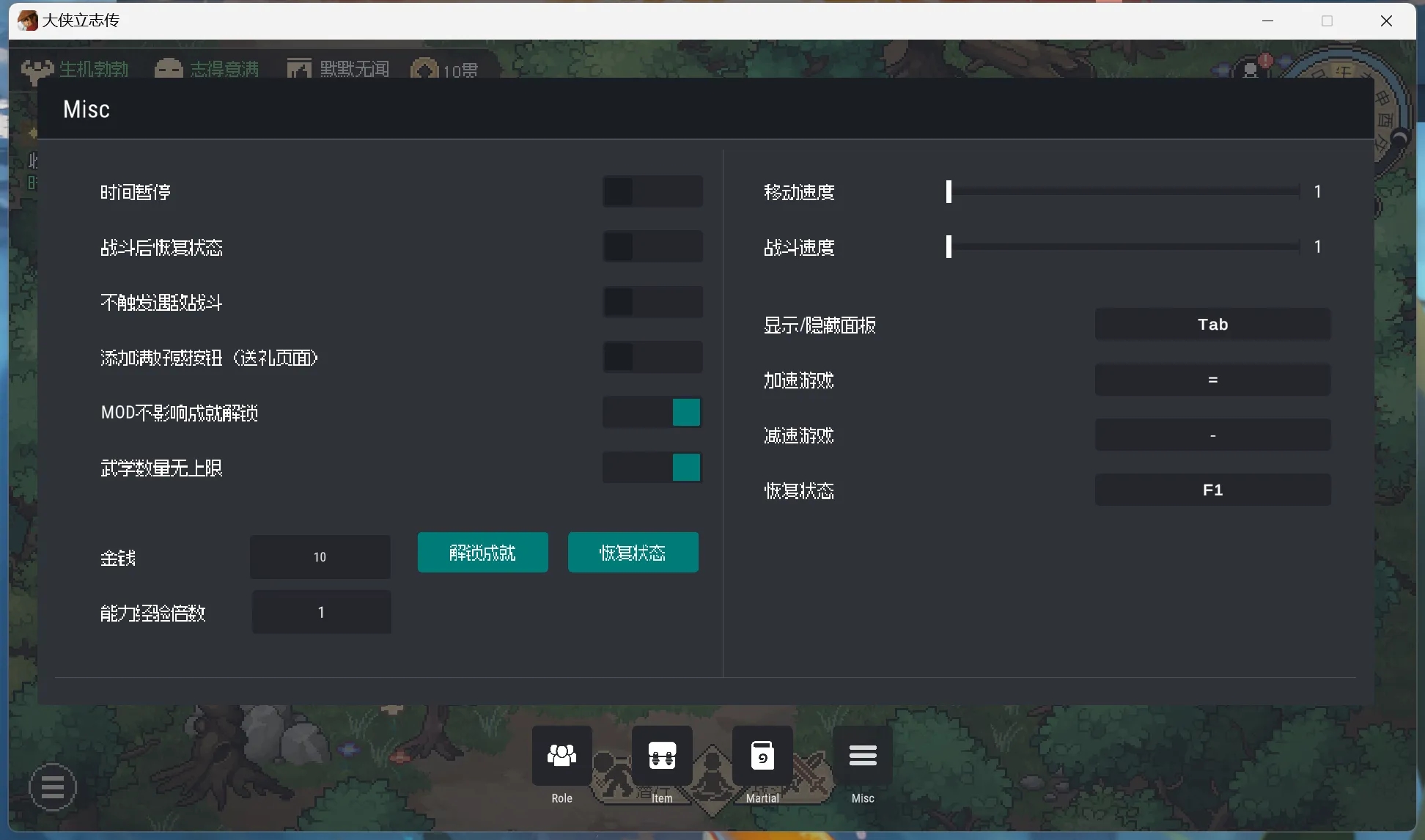 大侠立志传内置修改器这款游戏有个超实用的内置修改器,这款修改器它能帮你改角色属性,还能增加天赋、武学和物品,一键就能解锁各种成就,经验值和好感度也能快速涨上去。有了它,你当大侠的路就能走得更顺畅、更痛快。
