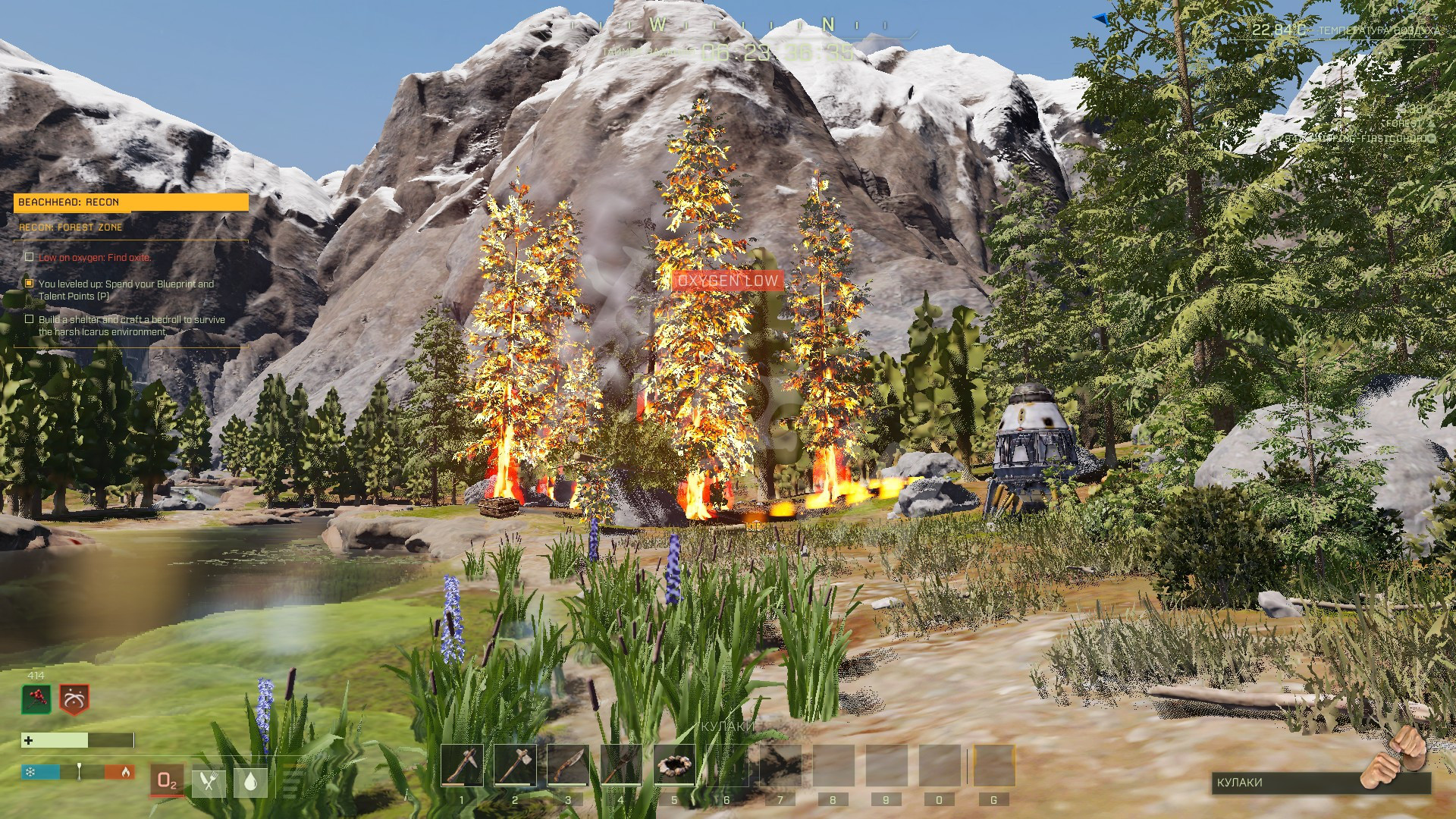 6.注意人物属性,水可以去喝,氧气可以挖氧矿(矿可以装备给人物),食物搂草时可以捞出树莓。