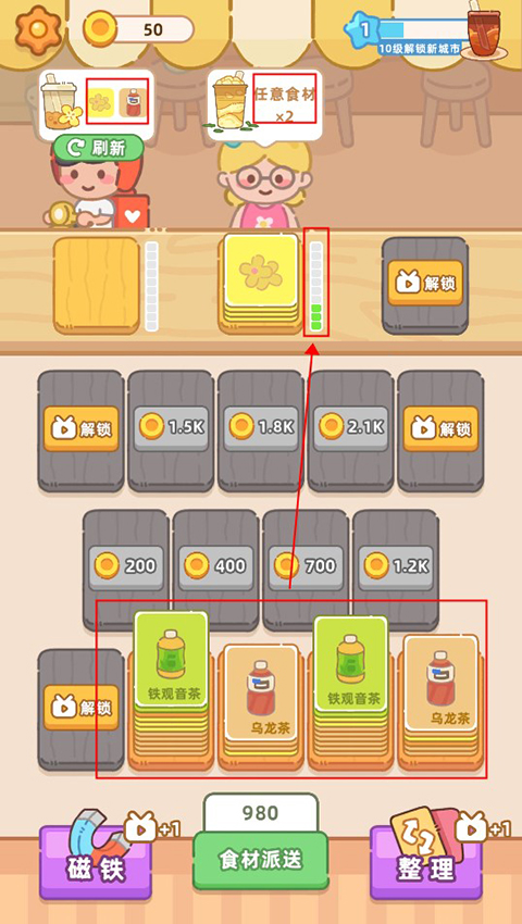 3、玩家通过完成订单可以获得金币,在拥有足够的金币后可以解锁其他额外卡片格子。