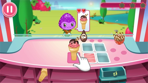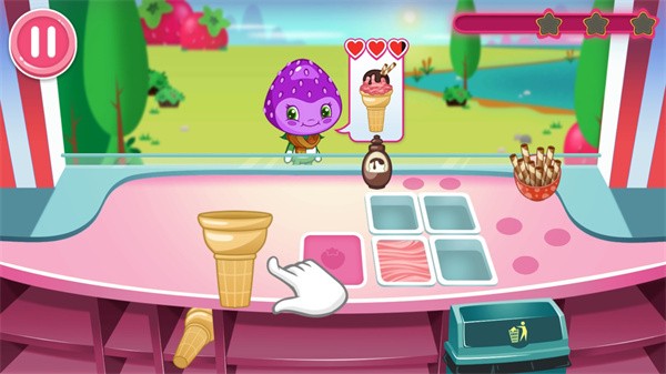 3、在每个关卡中,你需要根据顾客的口味制作出美味可口的冰激凌;为了满足客户的要求,你需要争分夺秒地填满客户的心;