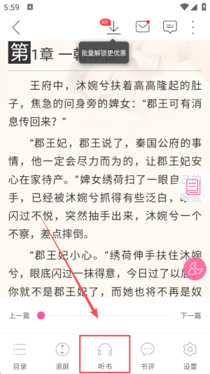 4、点击耳机图标,开启听书功能,让您在轻松愉快的氛围中享受阅读体验。