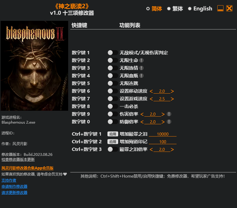 神之亵渎2十三项修改器是超稳的游戏辅助工具,它能帮你轻松修改游戏里的多项关键数值,比如直接增加赎罪之泪和殉道印记这些稀有资源,让你玩得更爽快。更厉害的是,开启无限生命、魔法和连跳功能后,再也不用担心翻车,各种高难度操作随便秀!想体验更刺激的战斗?这款修改器绝对是你的不二之选。