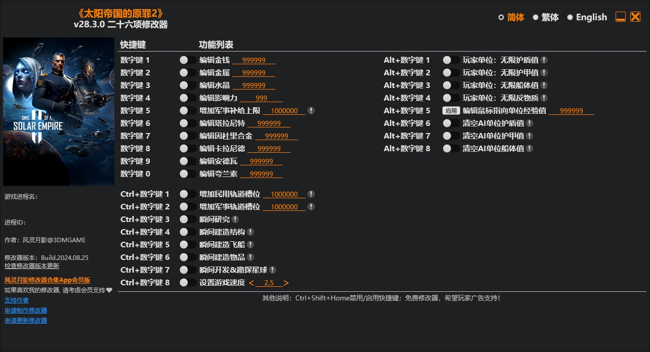 太阳帝国的原罪2二十六项修改器这款游戏修改器的功能十分强大且全面。它能帮玩家快速建造飞船,还能让玩家按照自己的想法自定义各种珍稀矿藏资源。此外,它具备增加大量护甲值等实用功能,有了它,玩家就能轻松组建一支全宇宙顶尖、无敌强大的舰队。