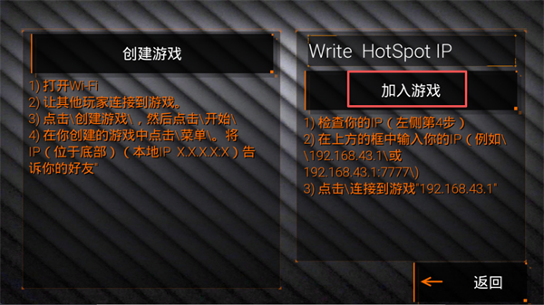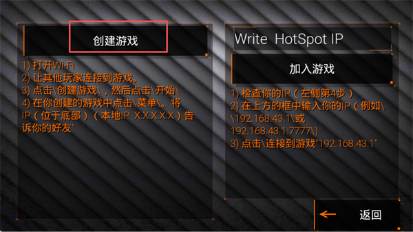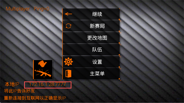 6、在你创建的游戏中点击菜单。将IP(位于底部)(本地IP X.X.X.X:X)告诉你的好友