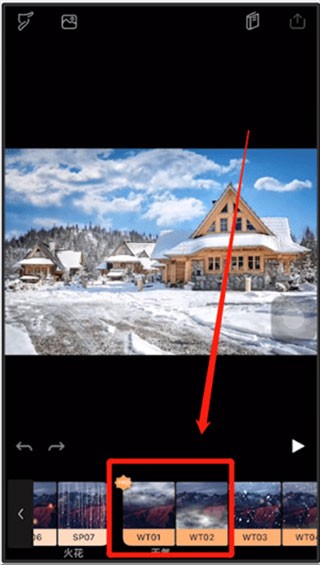 3、向左滑动,在天气分类下,选取第一个或者第二个效果。选择后,照片上方就会出现烟雾缭绕的效果。也可以调整上方的进度条,来增加烟雾的强度