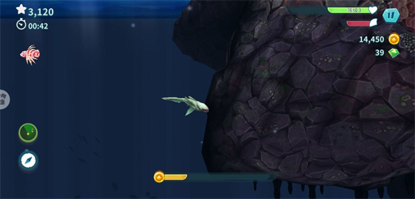 4、完成50个任务,寻找宝物取得金币与宝石,用来升级你的鲨鱼或者购买特殊救生道具;