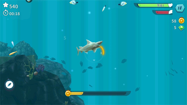 4、按住屏幕可以加速鲨鱼,同时也要注意不要吃到不能吃的东西;