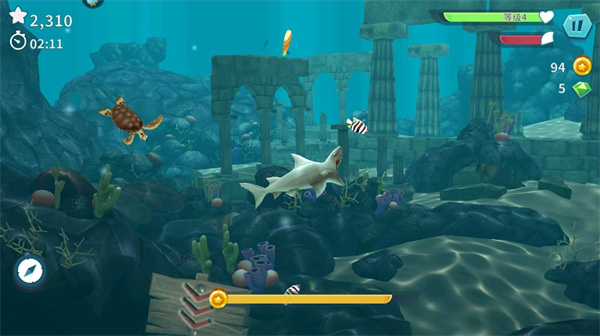 4、完成50个任务,寻找宝物取得金币与宝石,用来升级你的鲨鱼或者购买特殊救生道具。