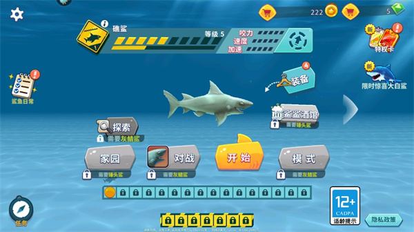 3、丰富的升级内容,可以通过升级强化提升鲨鱼的狩猎能力和生存能力。