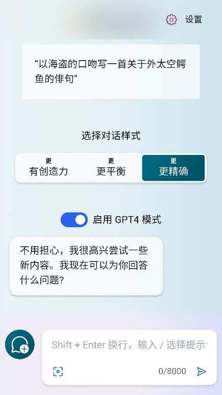 2、为用户提供了创意模式、精确模式和平衡模式等多种对话模式。