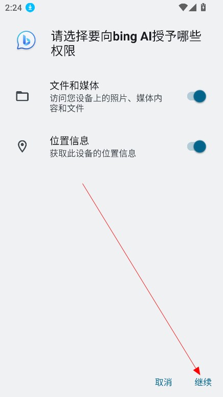 1、在本站下载安装Bing AI后,开启软件,点击继续,同意权限进入