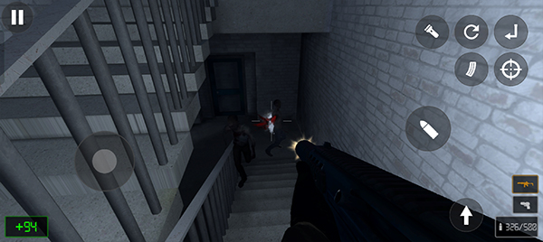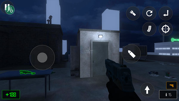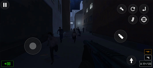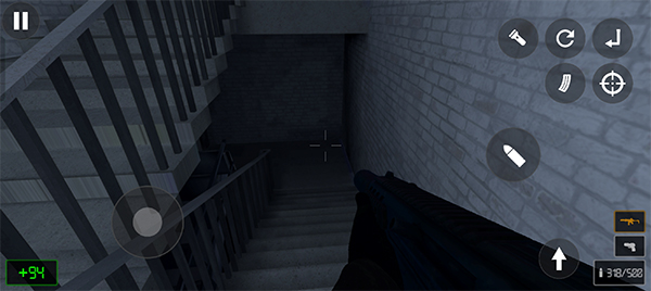 3、游戏的操作非常简单,左边控制人物移动方向,右边控制射击、换弹、瞄准等操作;