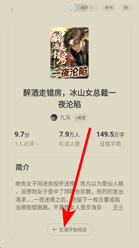2、在小说详情界面,点击左滑开始阅读按钮,进入小说阅读界面。