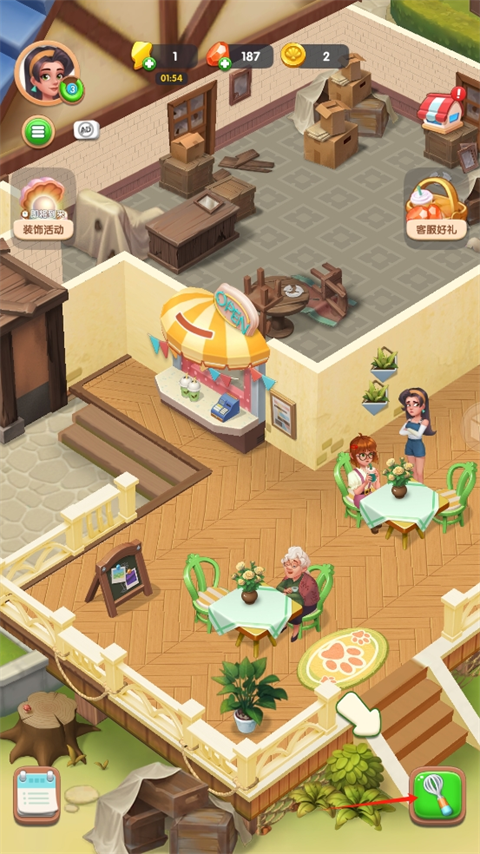 2、根据上方顾客需求来进行合成相应的食物,完成右上角任务后就能进行装修。