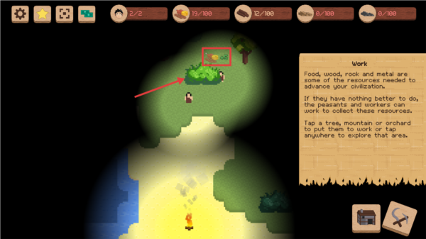 3、在夜晚,篝火可以照亮一片区域,便于村民进行工作,点击右下角工具图标,派村民去砍树,采集木材资源,推进文明发展。