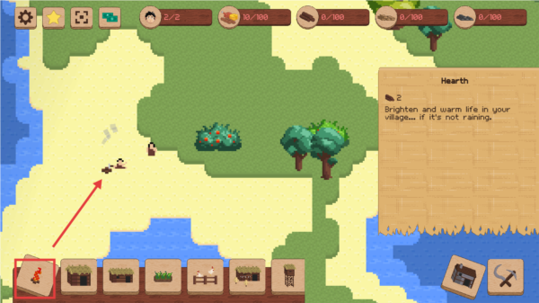 2、在地图中,点击下方建筑图标,将【篝火】放置到合适位置,搭建村庄基础设施呀。