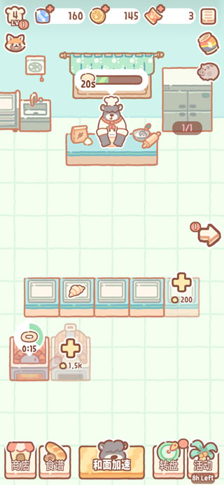 1、在本站下载安装好小熊面包店Bear Bakery最新版后,通过左右两侧的箭头切换房间,进入左侧厨房,通过连续点击下方的“和面加速”或者直接点击熊师傅即可加速制作糕点的速度,制作完成的糕点会出现在下方的格子里,需要拖动到下方的灶台才可以烹饪。
