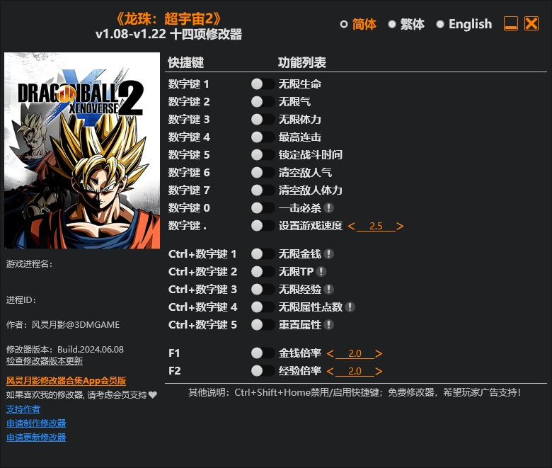 龙珠超宇宙2十四项修改器是款多功能修改器。玩家在游戏里能拥有无限生命值,战斗时间也能被锁定,还能自己调整游戏速度,甚至能把敌人的体力直接清零。这对于新手和平时休闲玩玩的人来说,能更快熟悉游戏玩法。
