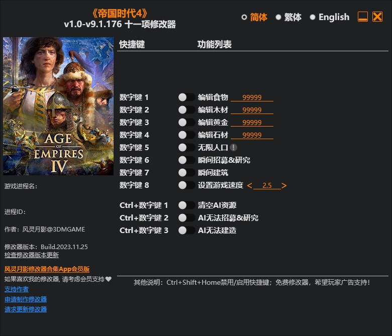 帝国时代4十一项修改器这修改器就是个游戏好帮手,你只要把对应的功能打开,就能随意修改游戏里的食物、木材、黄金、石材这些资源数量,还能调整人口上限,设置游戏是快进还是慢放,甚至能把现有资源一下子清零。