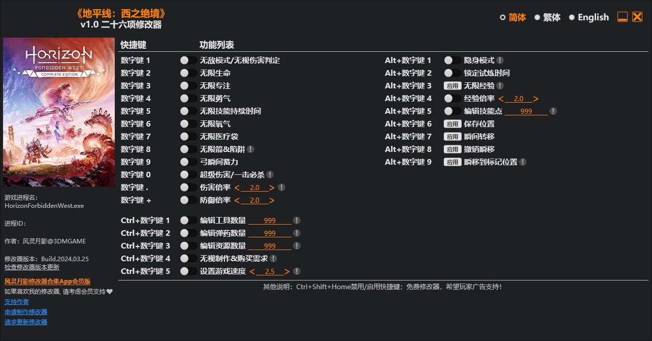 地平线西之绝境v1.0二十六项修改器是一款十分实用的修改工具,玩家在游戏里能开启各种“作弊”模式,让游戏难度降下来,或者体验完全不一样的玩法。这修改器足足有二十六项功能呢,像无限专注力、氧气用不完,还有攻击力超猛、一击就能打败敌人这些,都特别实用。