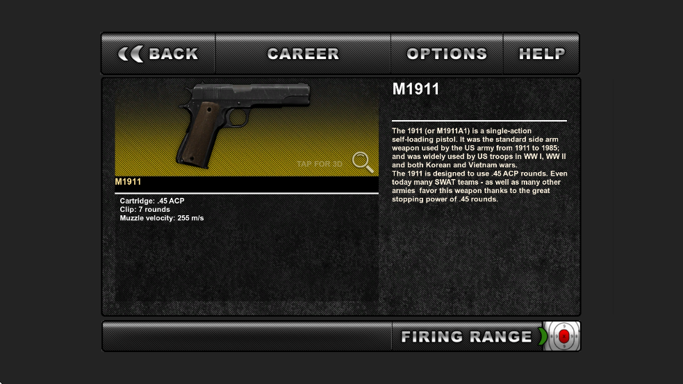 1911型(或称M1911A1)是一款单动式自动手枪。自1911年至1985年间,它一直是美国陆军的制式配枪,并广泛应用于一战、二战以及朝鲜战争和越南战争中的美军部队。该枪专为使用.45 ACP口径子弹设计。时至今日,众多特警队及其他武装部队仍青睐此武器,因其.45口径子弹具备卓越的制止力。