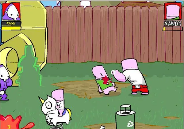 到了幼儿园,见一幼儿园老师也在“狂扁小朋友”,还打死了一个。 这家伙便是第一个BOSS,血量和玩家相当,建议用风车拳或拳脚大连环,打死为止。幼儿园内有三个油桶可当炸药使,还有个绿色垃圾桶,狂扁它可以增加爆气率。 提示:有个小孩骑的木马是会随机变化的。