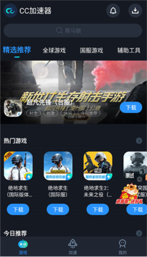 2、游戏页面:精选推荐、全球游戏、国服游戏、辅助工具;