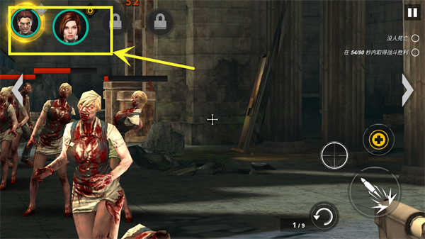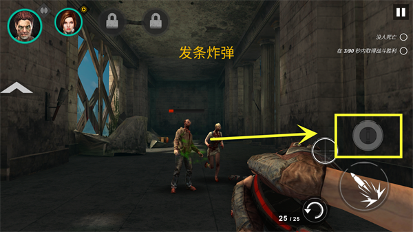 4、游戏基本操作很简单,按住左边屏幕移动可以进行视角转移,将屏幕中间的十字瞄准对准僵尸,然后点击右边射击即可击杀僵尸。