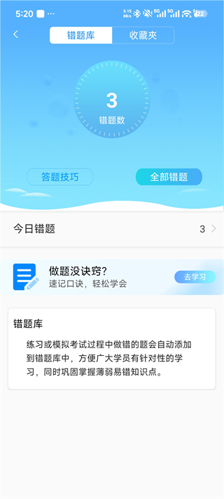 错题库会自动统计您做错的题目数量,您可以查看所有错题并学习相关答题技巧,该功能帮助您针对性地攻克薄弱环节,提升答题准确性。