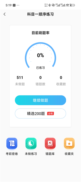 在科目一的练习过程中,您可以查看刷题进度,选择继续做题或进行精选200题必做练习。软件还提供考前密卷和错题库等功能,帮助您针对性提升薄弱环节,确保临考前做好充足准备。