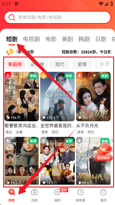 3、然后来到搜索首页,如图所示。这里有大量的短剧资源可以免费观看。