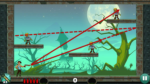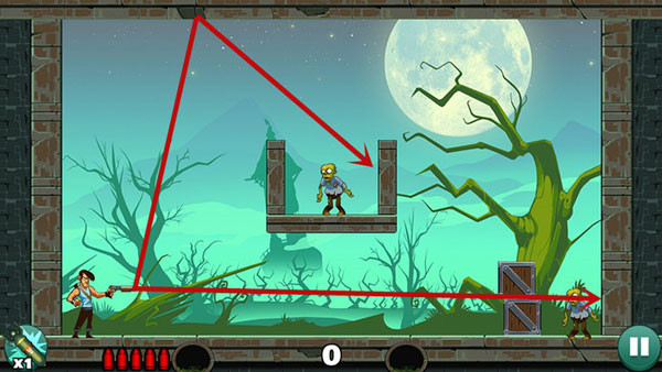 这关比较简单,只要平射一次或两次就可以把下面那个僵尸杀了。上面的僵尸利用反弹杀掉,找不准位置可以多用几发子弹来找