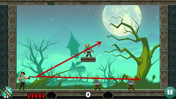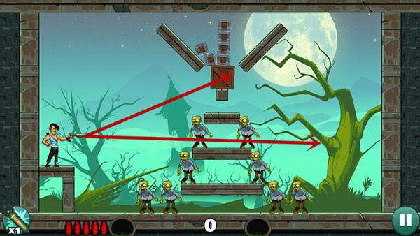 这关过起来最容易,没什么技巧,直接瞄准僵尸射击即可,如果想一发子弹过关不妨多试试不同的角度