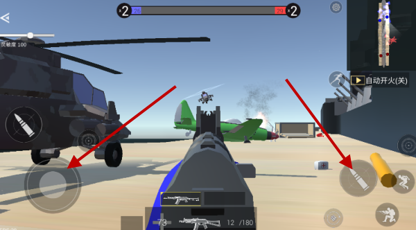 3、抵达战场后,屏幕左侧的摇杆可以控制角色进行移动,右侧拥有开火等按键。