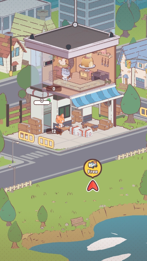 1、首先,玩家在本站下载并安装好游戏后,打开进入,先建设一下制作甜点的业务吧,点击下图的【free】按钮,会获得制作焦糖布丁的新业务以及一只新猫咪陌陌;