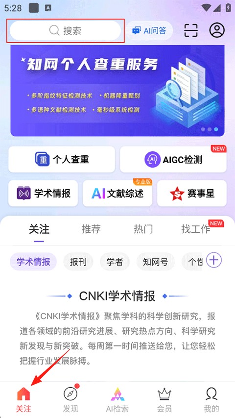 1、打开手机知网APP,点击屏幕上方的搜索栏;