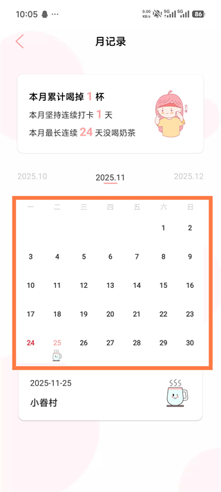 1、打开吨吨奶茶App【首页】主界面,点击【本月已喝]一【月记录】界面,点击下图框选内容中相对应的日期即可补卡