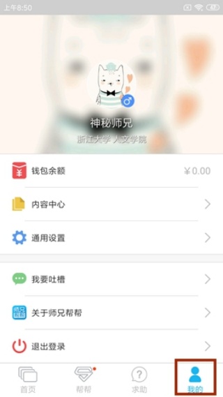 1、首先我们打开软件,来到软件的首页,这里就是软件的主要功能的使用区域,我们在这里可以向师兄发起提问,也可以给师弟们解答问题,获得酬金。