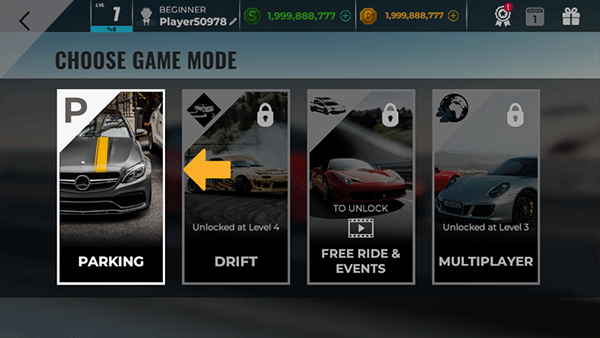 1、在下载安装真实停车大师游戏之后,来到大厅,根据游戏提示点击GARAGE进行冒险。