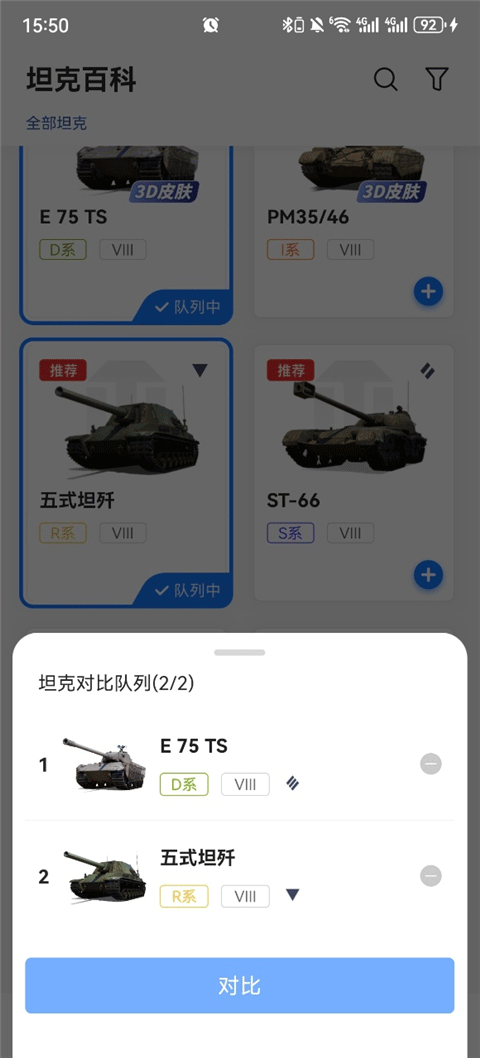 2、点击+选择你需要对比的坦克,只能添加2款坦克进行对比,如需要添加其它取消当前坦克添加其它坦克进行对比即可。