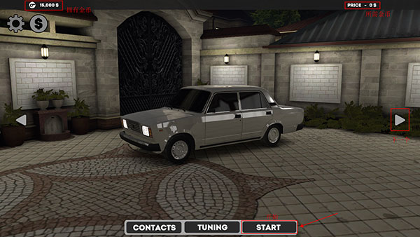 打开游戏后进入选车界面,屏幕中央显示当前可驾驶的车辆,左上角显示玩家拥有的金币数量,右上角显示所选车辆所需金币,下方的【Start】按钮用于开始游戏,若想更换车辆,可点击屏幕右侧的车辆切换按钮。