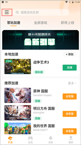 然后打开app,并进入主界面【手游】,这个界面包含常玩加速、全部游戏、即将上线这几个部分,点击左上角的三横图标。
